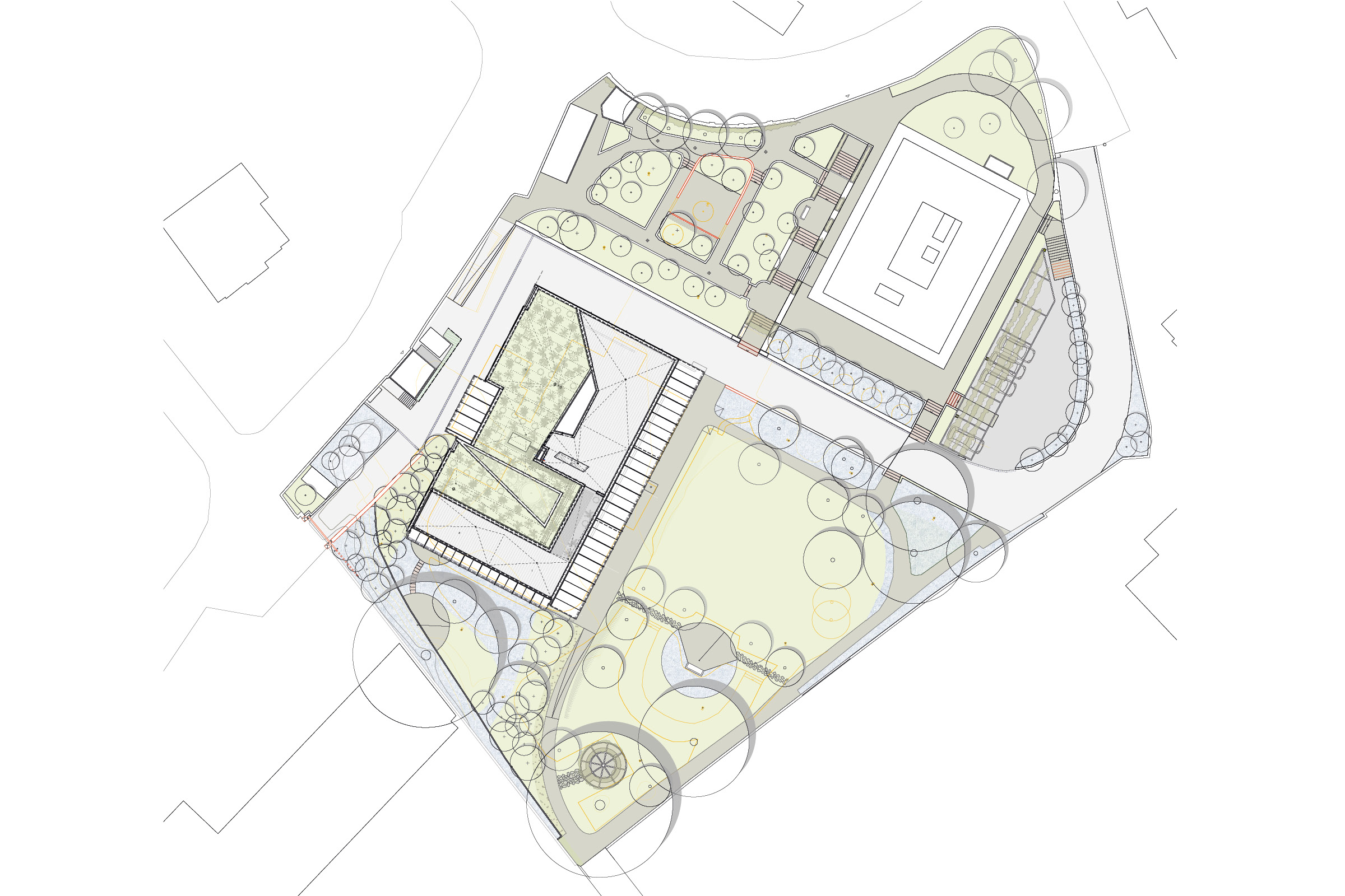 Erhellt wird der Garten durch von Jörg Boner konzipierte Leuchten. Diese reagieren auf die jeweiligen Gegebenheiten und verzichten bewusst auf direktes Anleuchten der Bäume.