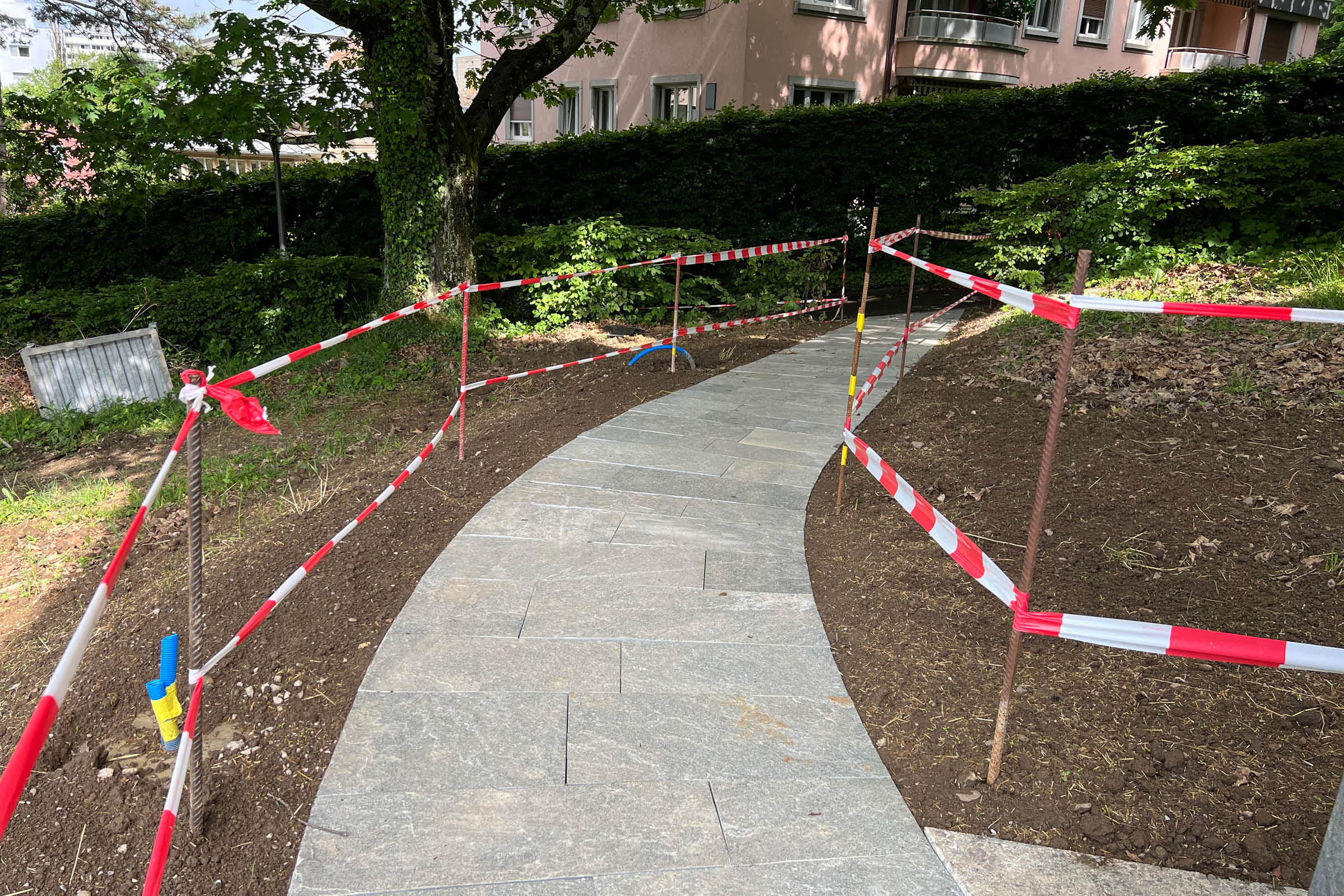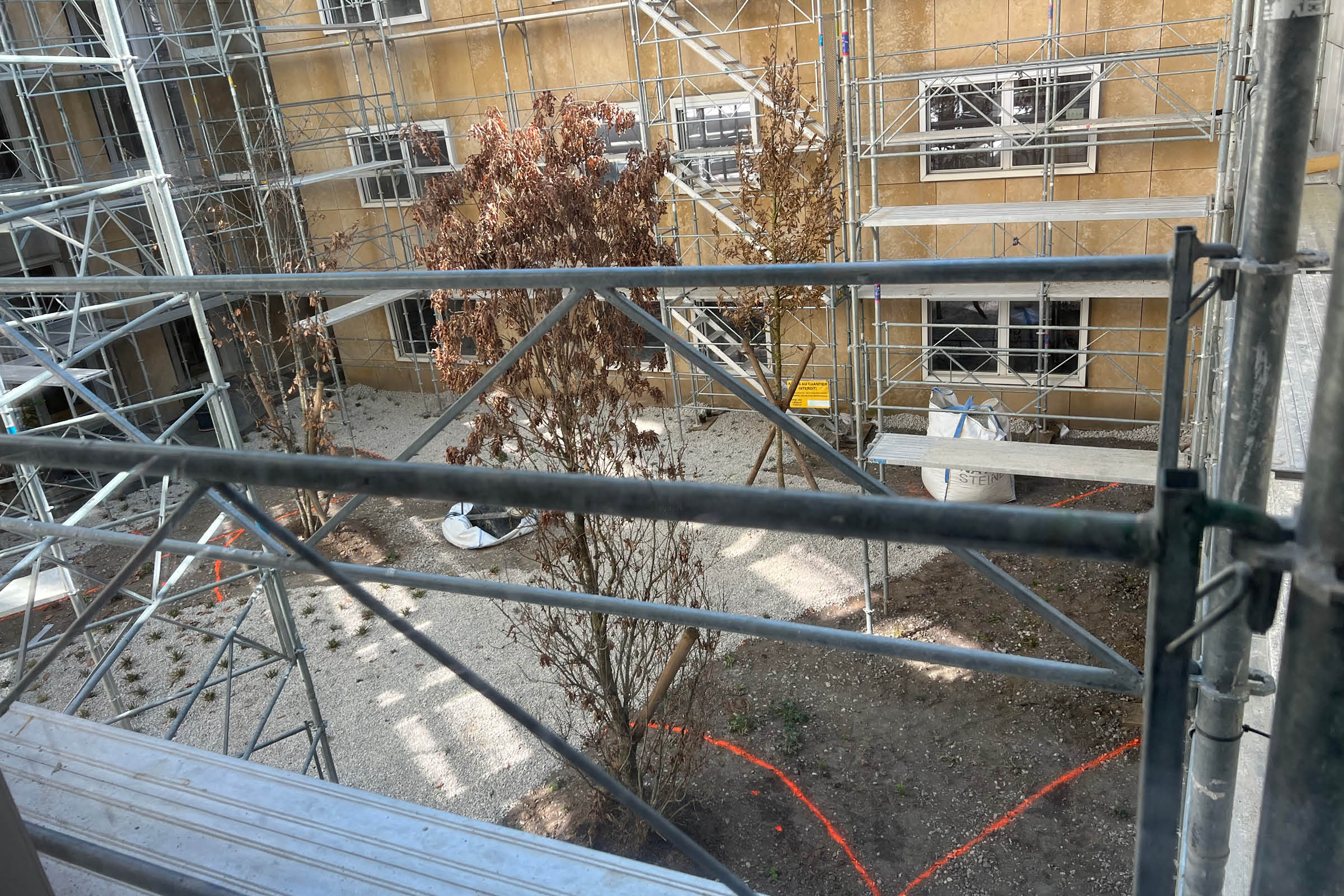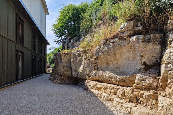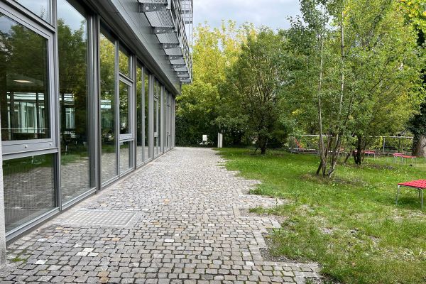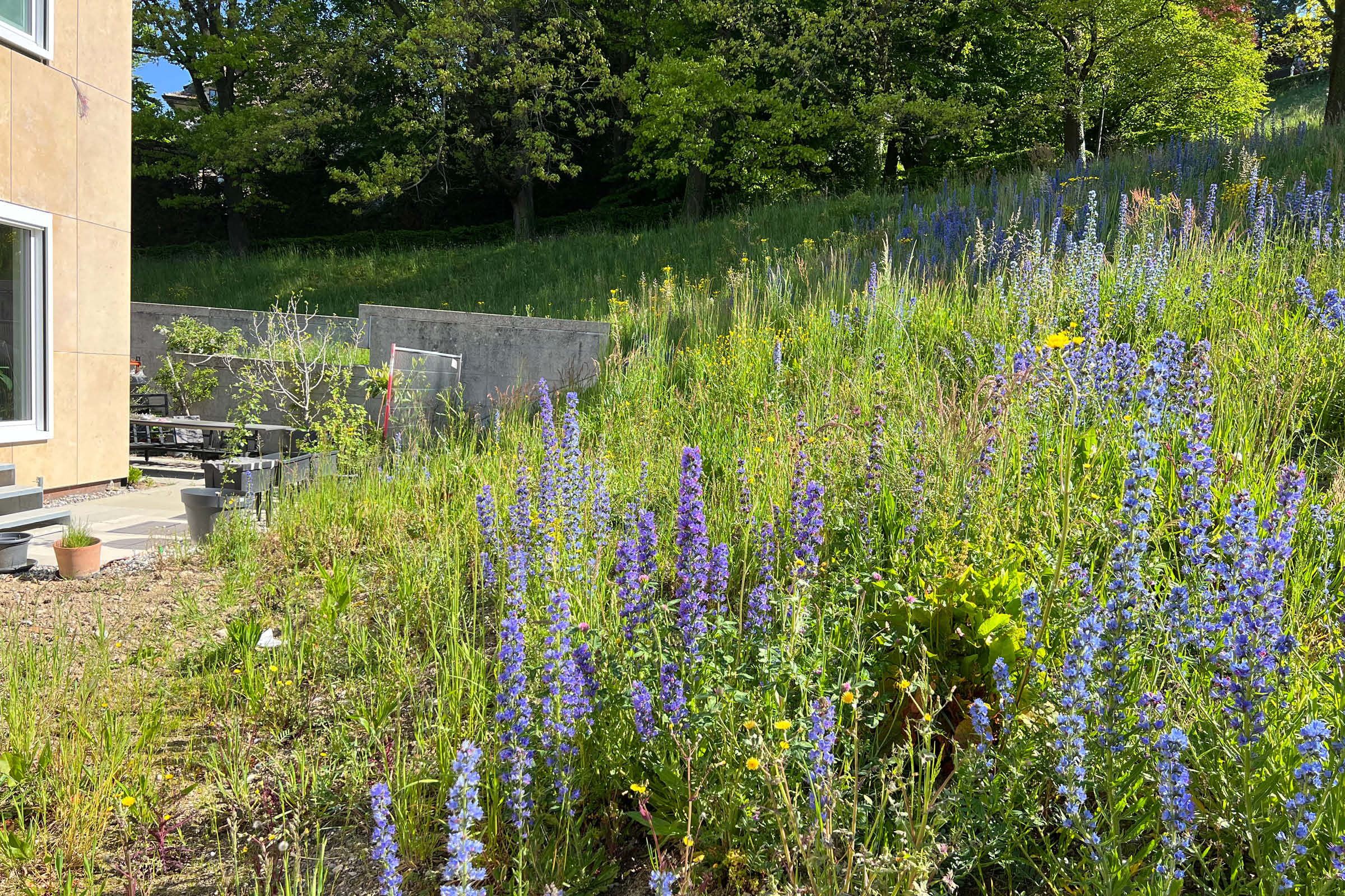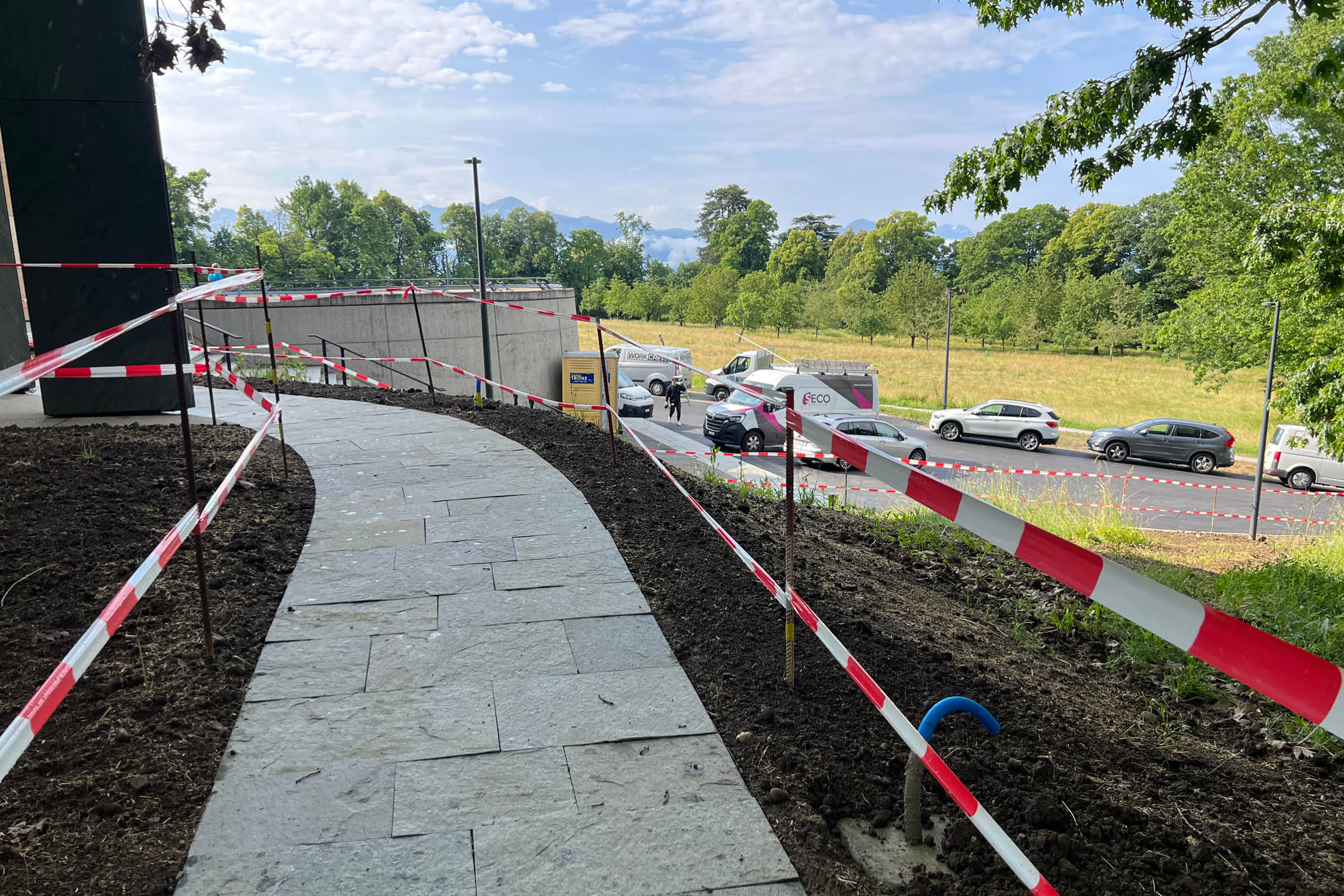 La plantation de quelques nouveaux arbres complète les bosquets existants et forme de nouveaux axes de vue sur le grand paysage. L‘accès à la nouvelle entrée administrative s‘effectue quant à lui depuis l‘esplanade existante. La prairie fleurie, étirée jusqu‘au pied de façade encercle et étreint le nouveau bâtiment.