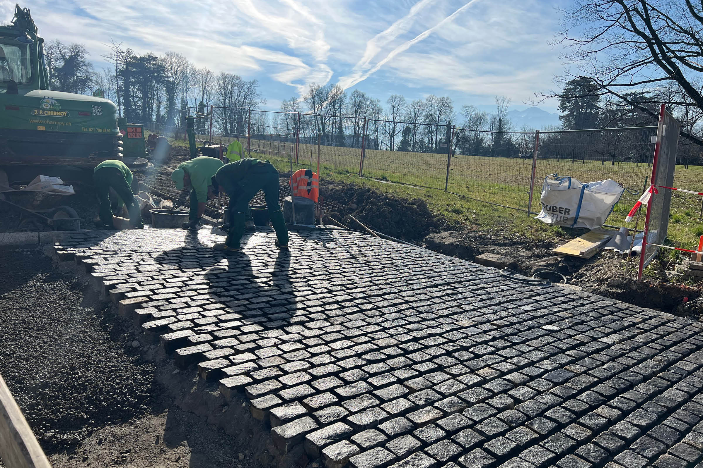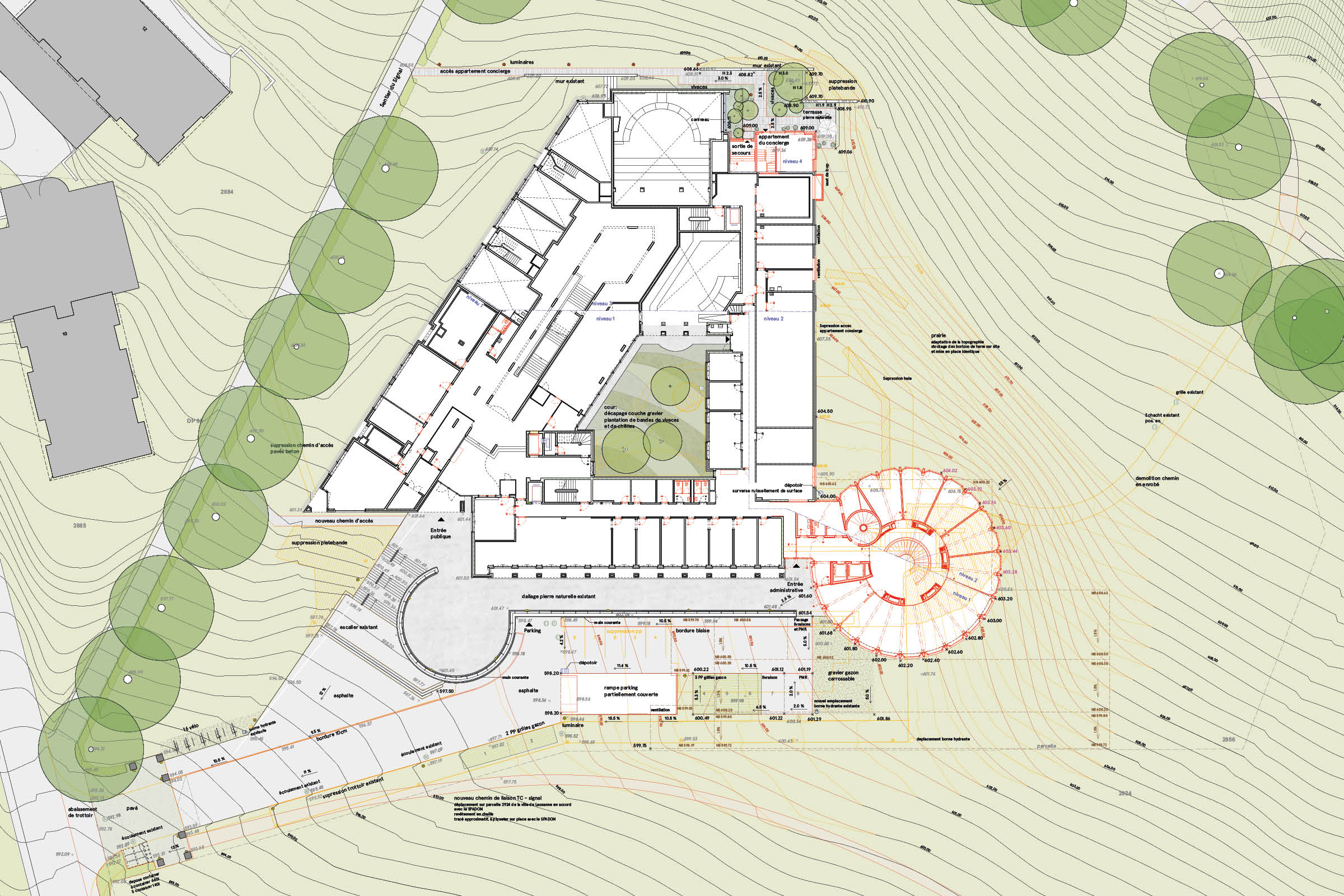 Le parc de l’Hermitage se situe à l’extrémité sud des bois du Jorat, avec ses bosquets et ses alignements d’arbres. Il forme l’écrin paysager au sein duquel s’implante le tribunal cantonal. L’extension permet de réorganiser et de clarifier les aménagements extérieurs autour du bâtiment. Ainsi, un nouveau tracé en lien avec la topographie et le panorama est proposé à distance respectueuse du Tribunal.