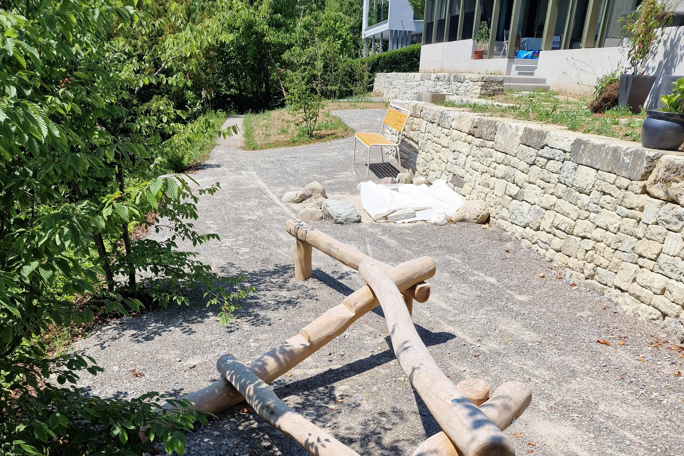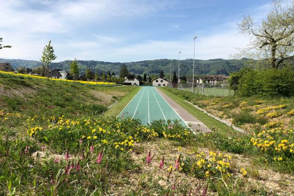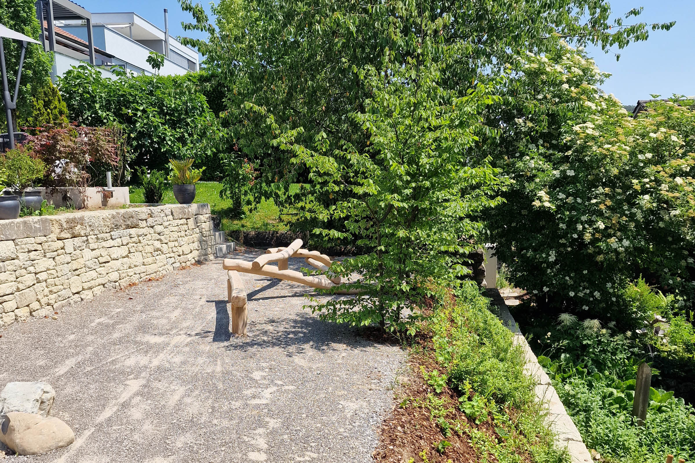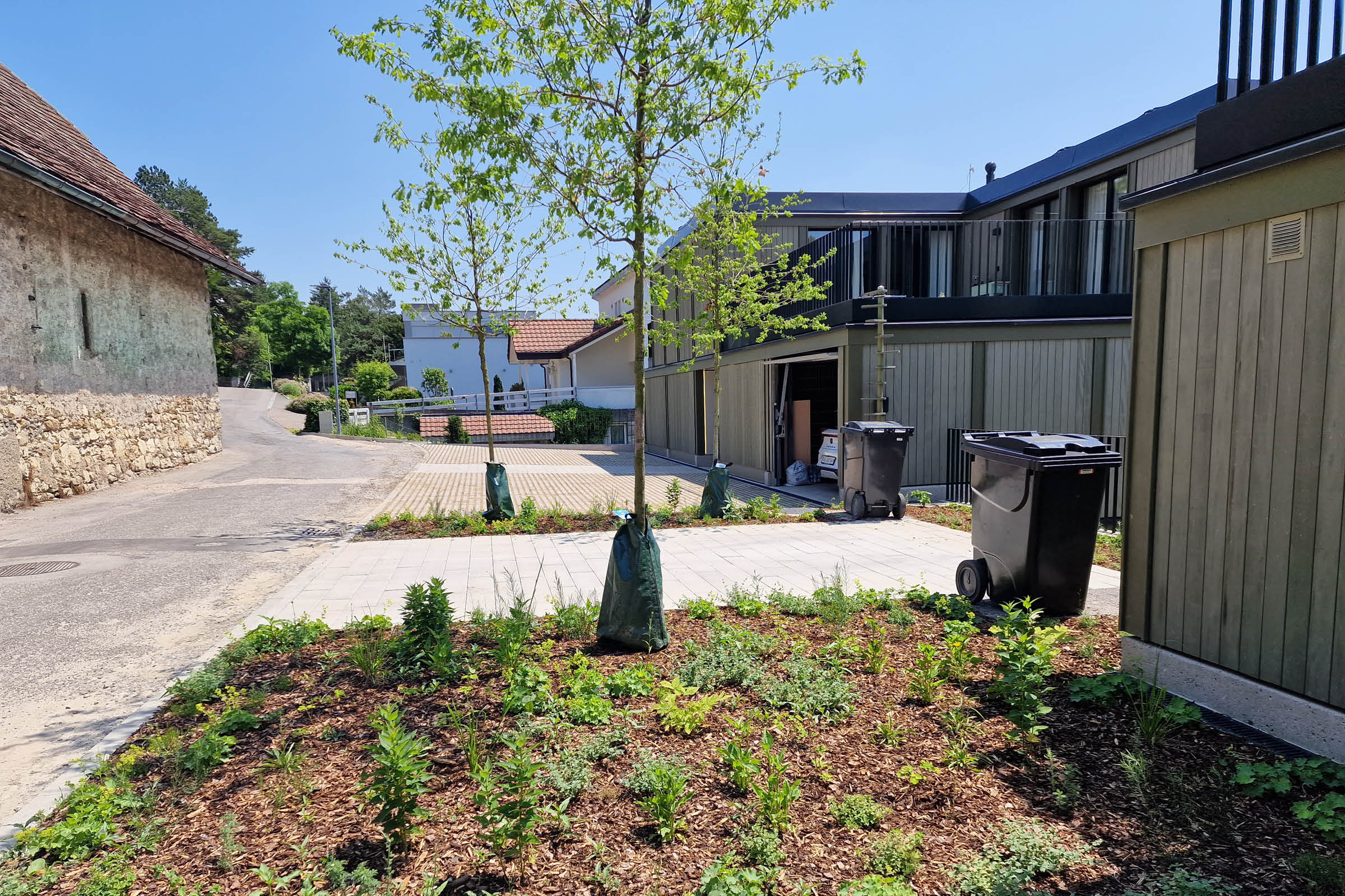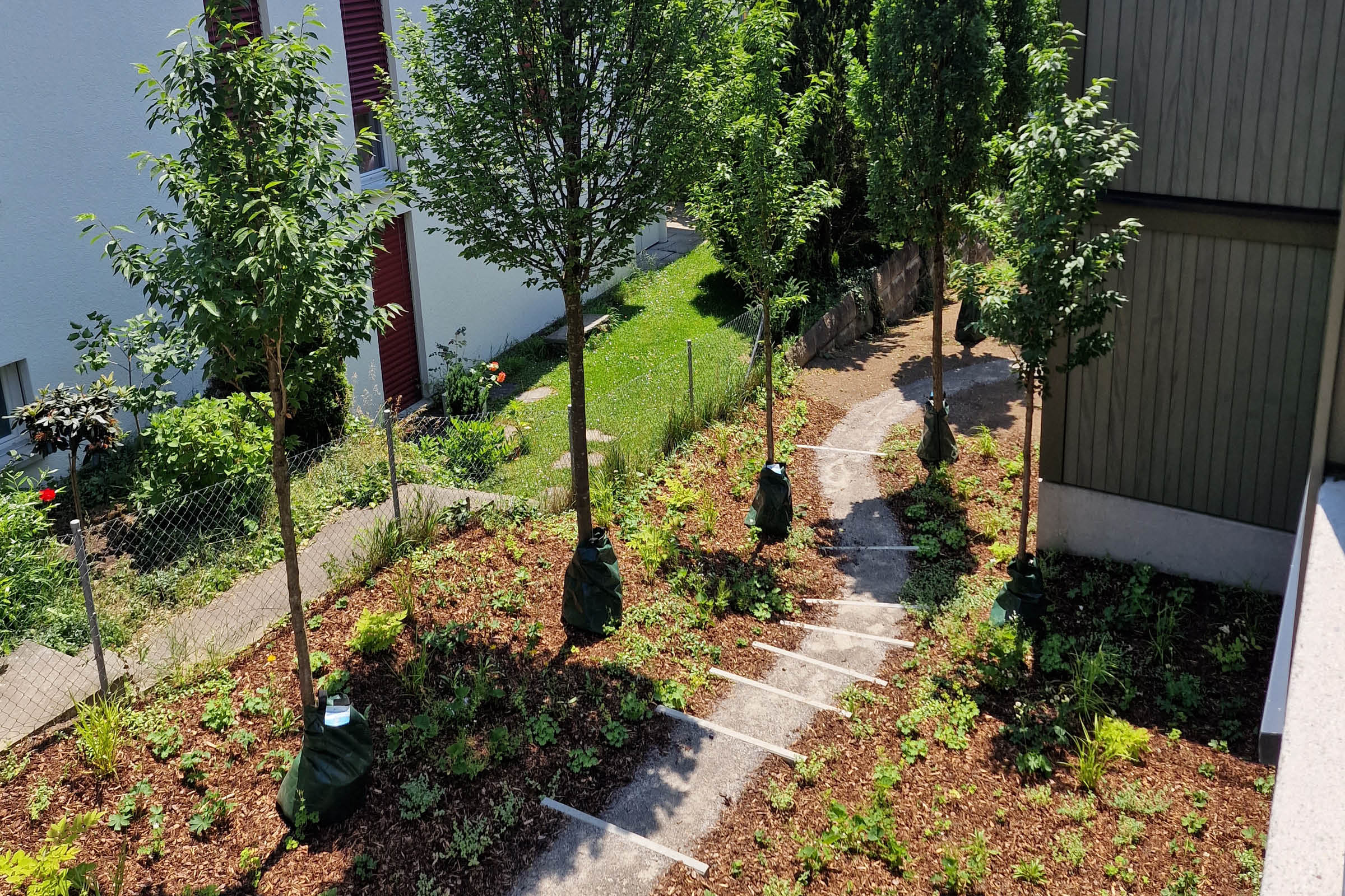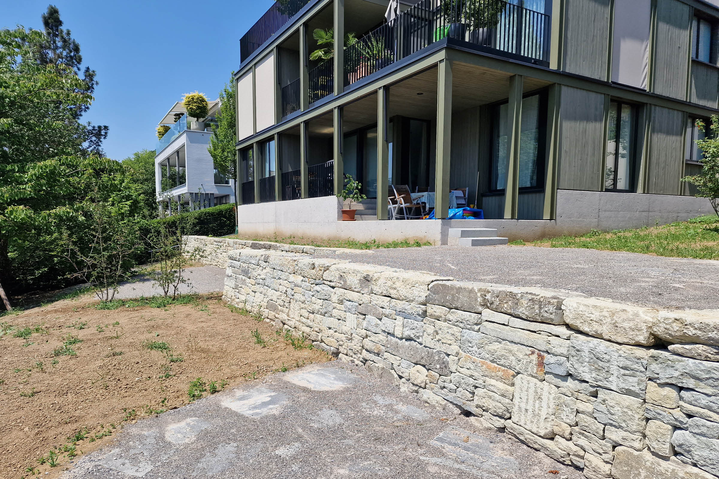 Erschliessung und Parkierung prägen den Raum zur Strasse, drei grüne Finger mit Baum- und Staudenpflanzungen erschliessen den Südgarten. Der Hang wird mit Trockensteinmauern terrassiert, in den entstehenden Ebenen laden Sitzplätze zum nachbarschaftlichen Treff ein, umschlossen von Blumenrasen. Auf den Sitzplätzen und Wegen können Gneisplatten, die bereits dem vorherigen Garten gedient hatten, wieder ihre Funktion erfüllen und auch der Brunnen findet im neuen Garten seinen Platz.